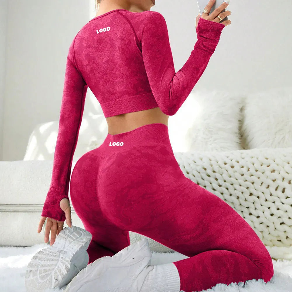 2PCS Custom Seamless Camo Yoga Sets Workout Running Yoga Wear Long Sleeves Tops Push up Leggings Sportswear Gym Fitness Sets