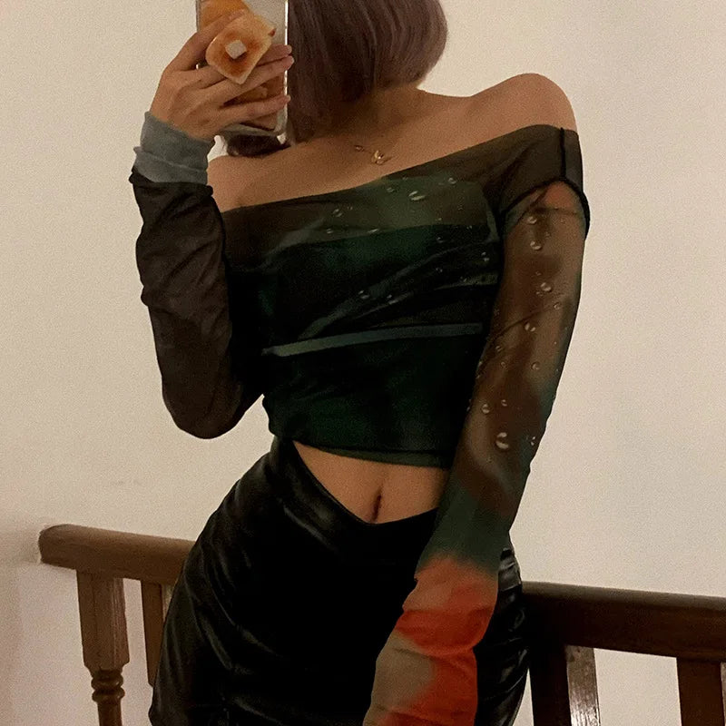 Y21TP483 Spring 2023 New Trendy Screen Print Off Shoulder Pullover Long Sleeve Casual Women'S Top Y2K Clothes